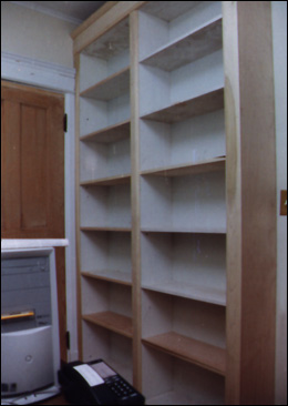 | Simple, clean bookcases built into place and painted white for a home office. | |