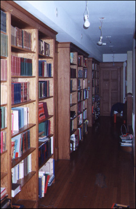 | Here we built a bank of bookcases to match the trim details of the existing woodwork in the hallway. | |